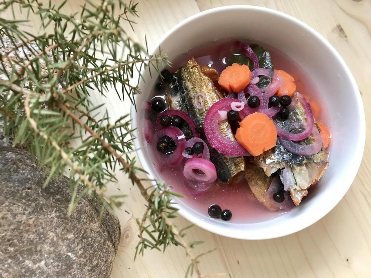 Räimefilee*, till, vürtsid, sool, suhkur, kadakamarjad, majonees*, muna*, riivsai*, nisujahu*, äädikas, mugulsibul, porgand