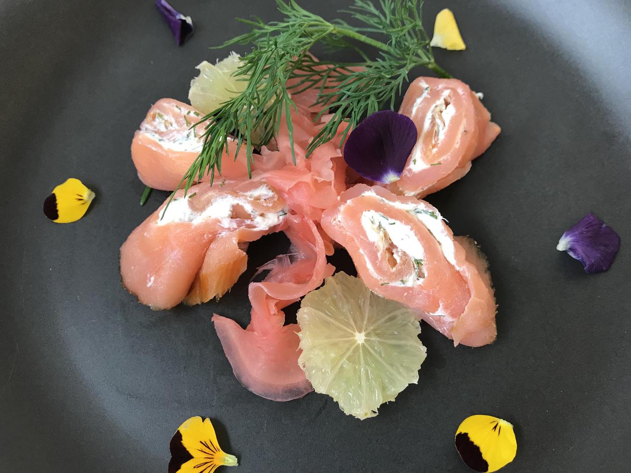 Külmsuitsu lõherullid mädarõika-toorjuustu täidisega