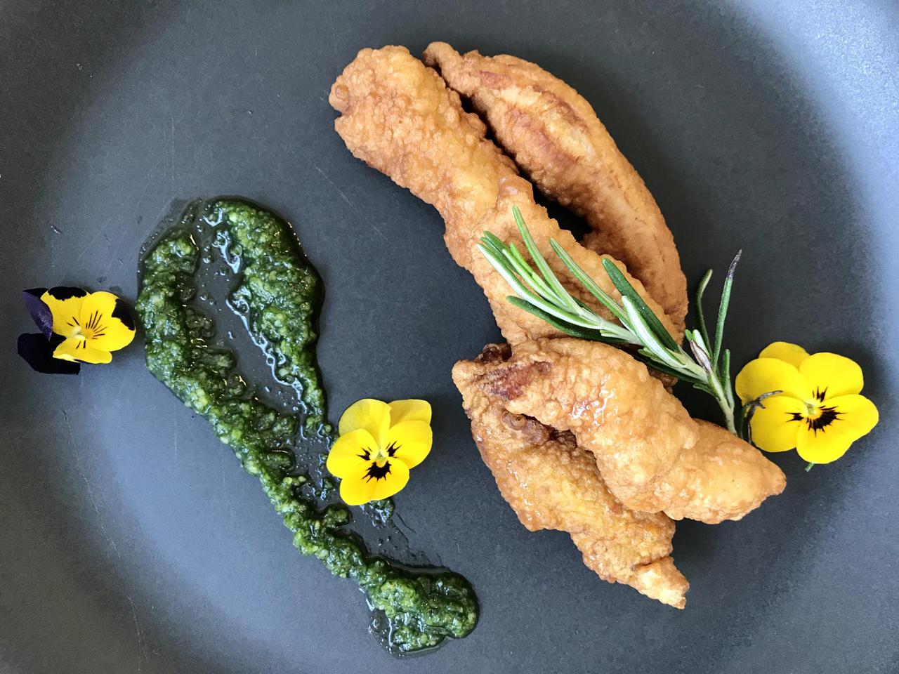 Friteeritud kanaribad taignas, pestoga