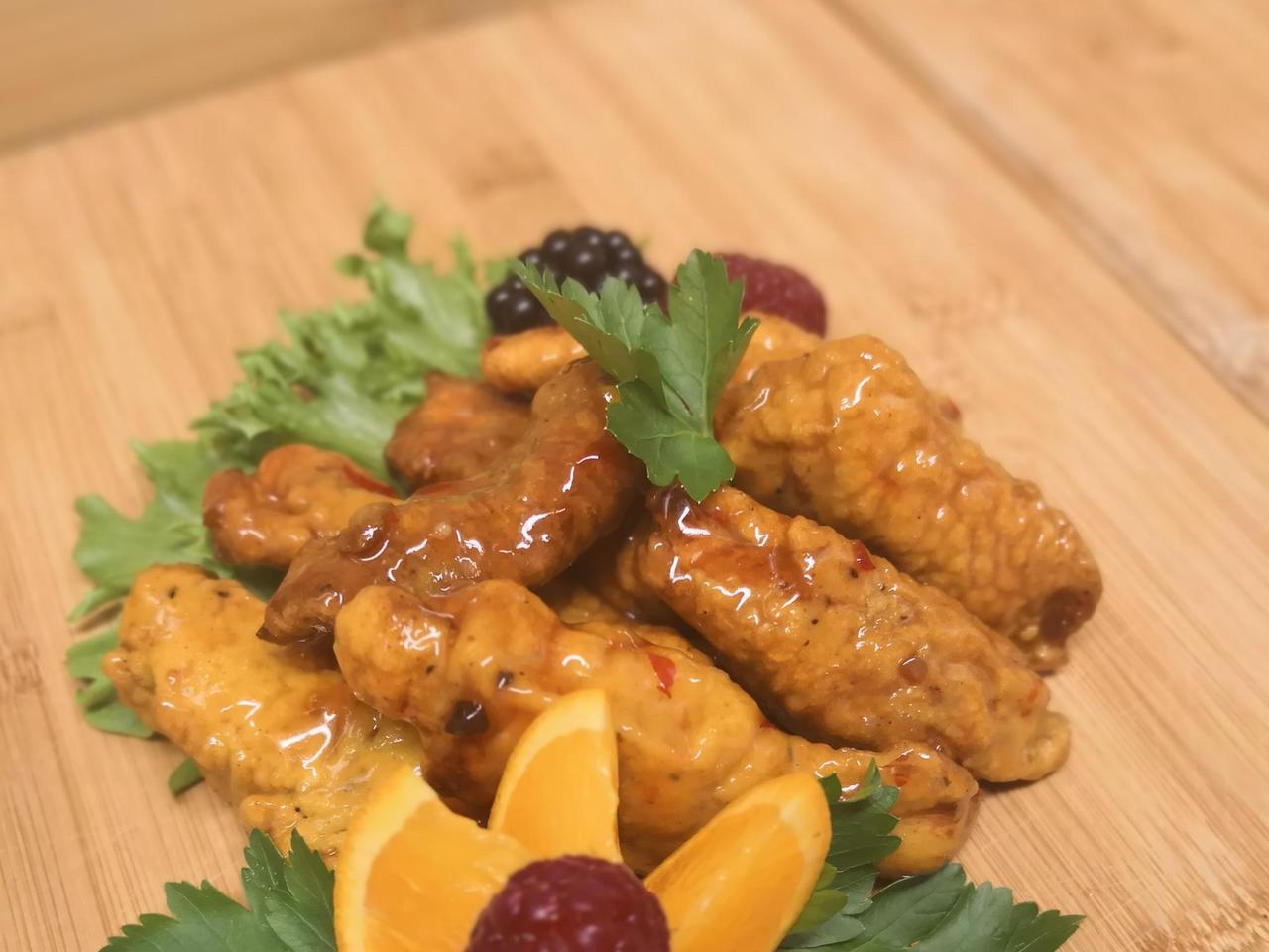 Kanafilee, nisujahu*, muna, majonees*, vürtsid, suhkur, sool, õli, tšilli, sojakaste*, ingver, maisitärklis