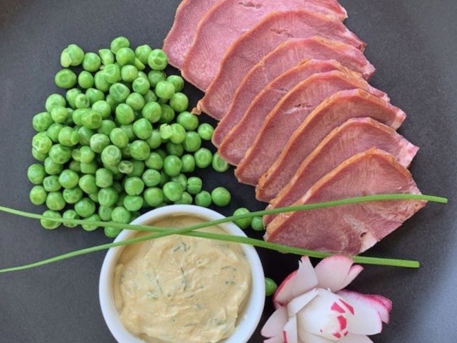 Kergelt suitsused seakeele lõigud rohelise herne ja mädarõikakreemiga