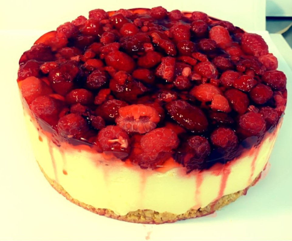 Valge biskviit, juustukreem, amaretto, maasikatäidis, vaarikapüree