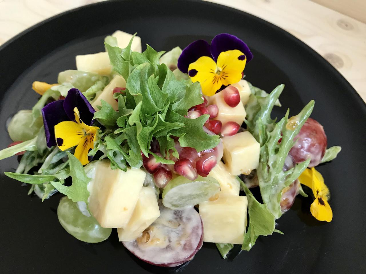 Viinamarjad, rohelised võrsed, granaatõuna seemned, murakapüree, suhkur, sool, pipar, Kreeka jogurt*, Eesti juust*