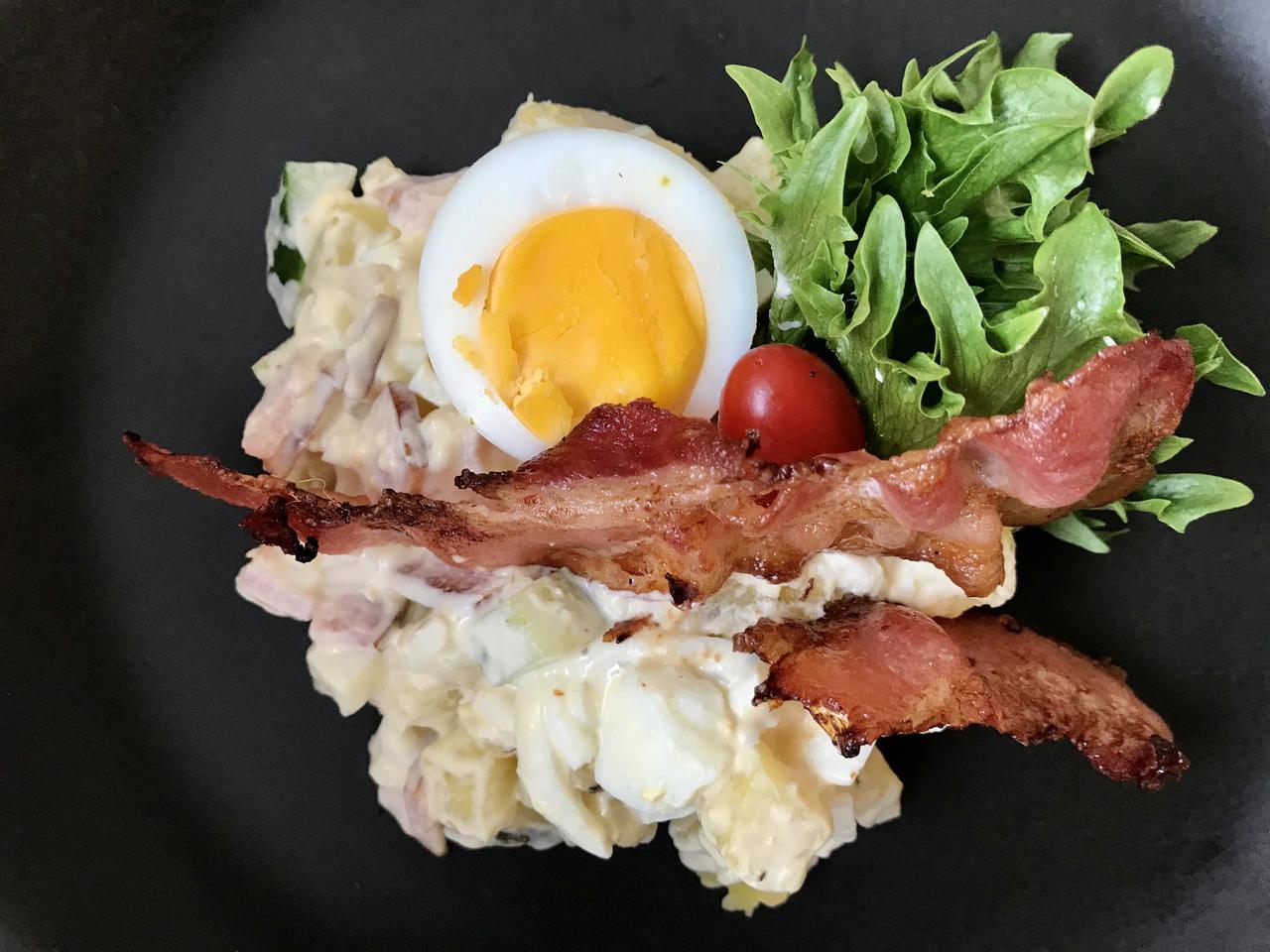 Kartul, porgand, marineeritud ja värske kurk, sibul, sealiha, muna*, majonees*, hapukoor*, sinep*, pipar, sool, suhkur
