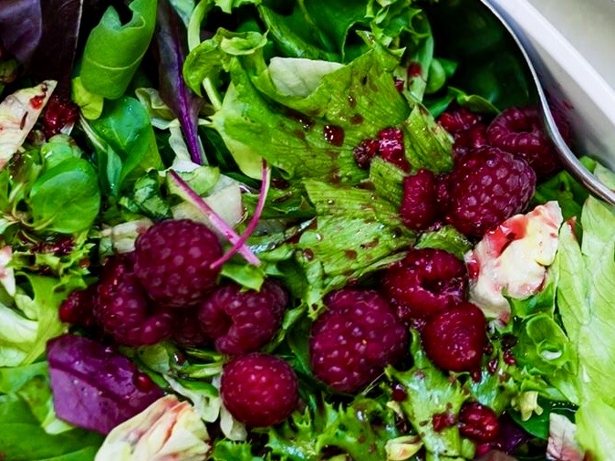 Erinevad salatilehed, vaarika vinegrett (vaarikad, õli, punaveini äädikas, ürdid, suhkur, sool)